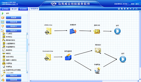 馬克威云挖掘軟件是數(shù)據(jù)分析軟件中以分布式架構(gòu)的大型統(tǒng)計分析和數(shù)據(jù)挖掘軟件,具有完全自主知識產(chǎn)權(quán)(備案號2013SR092246)。馬克威云挖掘軟件能夠獲取云端數(shù)據(jù),如: HADOOP平臺、阿里云飛天平臺等,通過數(shù)據(jù)挖掘和統(tǒng)計分析算法建立概念模型,從海量數(shù)據(jù)中尋找規(guī)律和知識,為決策者提供科學(xué)的決策依據(jù)。目前運行單張表數(shù)據(jù)量為3.4T,處理速度為36秒左右。